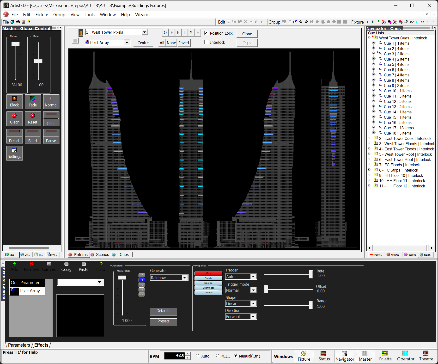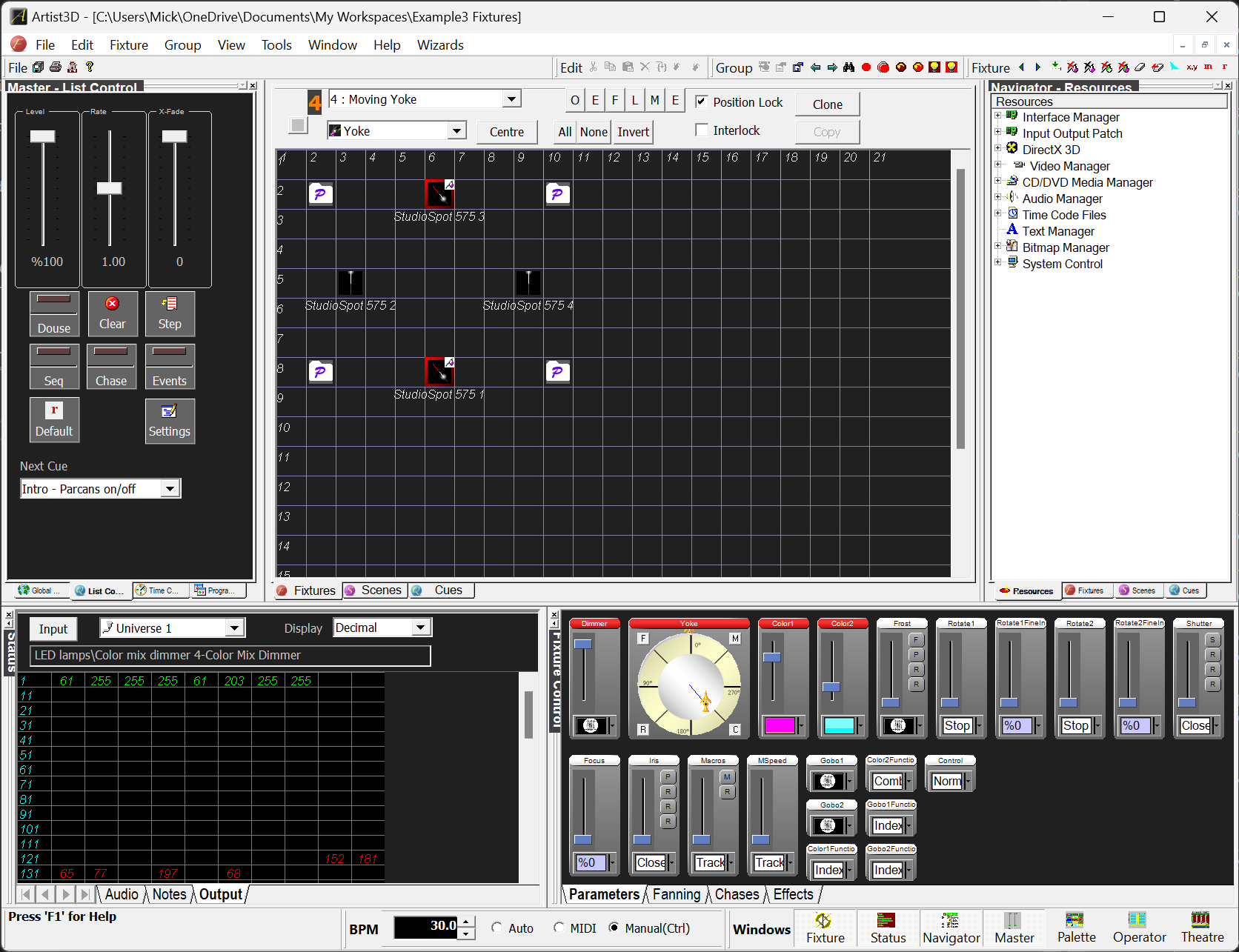 ShowCAD controls all types of DMX lighting fixtures; fixed spots and par cans, moving lights, video, audio, pixel tape, projectors and other sub-system controllers